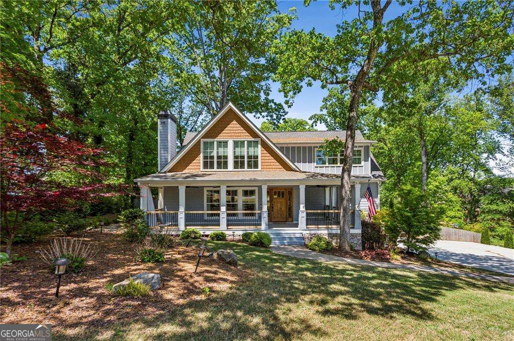Welcome home to refined resort living, where thoughtful design meets effortless functionality. A covered front porch, right out of Southern Living, leads into a sun-soaked interior with an impressive two-story open floor plan complete with vaulted ceilings, exposed red oak beams and a kitchen to make your entertainer's heart skip a beat. Featuring Bosch stainless steel appliances, quartz countertops, double ovens, a large island with seating, and a custom walnut bar, the kitchen is designed for hosting family and friends. Overlooking the living and dining with soaring ceilings, the home feels both grand and comfortable all at the same time. The main level includes two spacious bedrooms, one with access to a covered deck, along with two full bathrooms featuring built-in Bluetooth speakers. Upstairs features a loft and bonus laundry closet leading to the primary suite with vaulted ceilings, private covered deck, and a spa-like primary bath. The soaking tub, double vanity, custom closet, and large, tiled shower with multiple shower heads make waking up a delight. The fully finished basement provides excellent flexibility for customization with additional living space, a bedroom, full bath, laundry, a gym, and a stove connection. This space is ideal for an in-law suite, separate apartment, home office, or teen quarters. The backyard is designed for both entertaining and relaxation, complete with a heated in-ground pool, oh so much patio space, a fire pit, storage sheds and a fully fenced yard with ample green space for kids, pets, and yard games. The home is truly move-in ready. The sellers did the heavy lifting with features including 2 new water heaters, new pool liner, waterproofed basement, newer AC units, hookups for outdoor kitchen, hot tub, and basement kitchenette. Plenty of room on the property to add a garage as well! This resort-like home, located in the coveted Lassiter High district, is minutes from downtown Roswell and downtown Woodstock, walking distance to restaurants, and has easy access to parks, shopping, and dining. Welcome home to luxury living on Easy Circle.